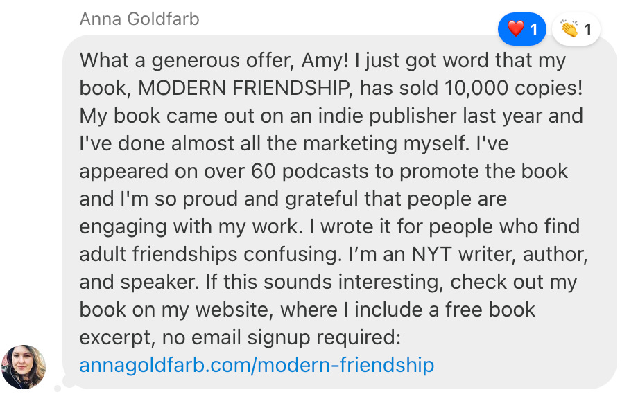 Congrats to Anna Goldfarb for selling over 10,000 copies of her book Modern Friendship (grab the book or read the excerpt here) and also so impressive — cracking book marketing!