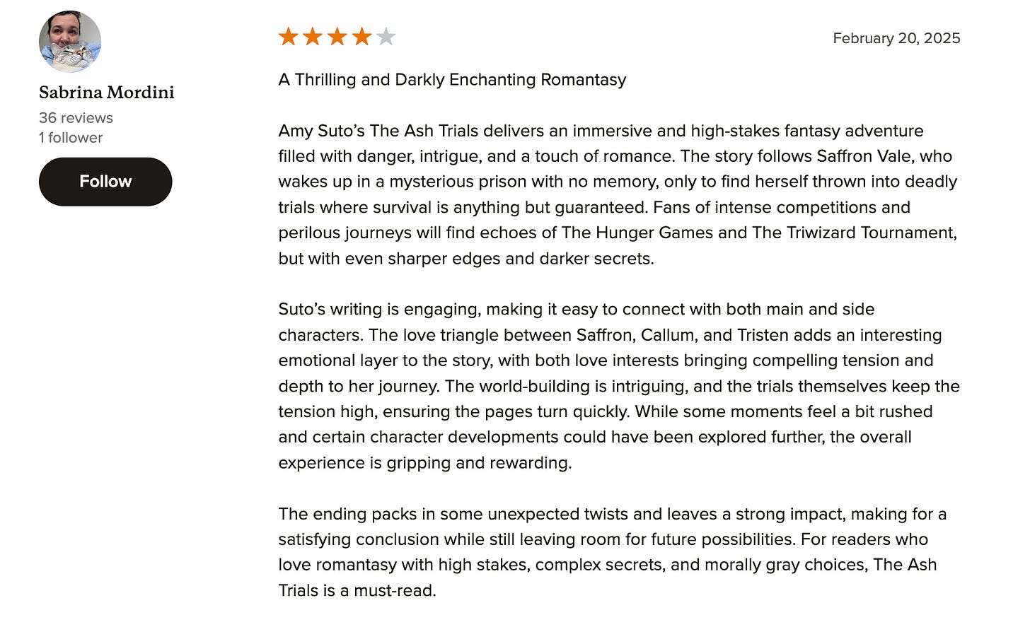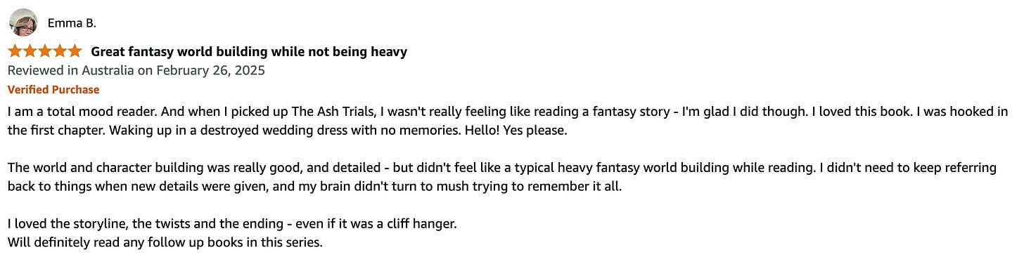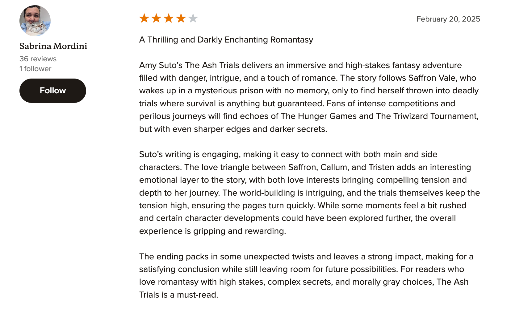 Thank you to everyone who has continued to leave such kind reviews on Amazon and Goodreads for The Ash Trials! It means the world that you’ve shown up for the book, and it’s been so much fun to read your emails and messages about what you’ve enjoyed about the story.