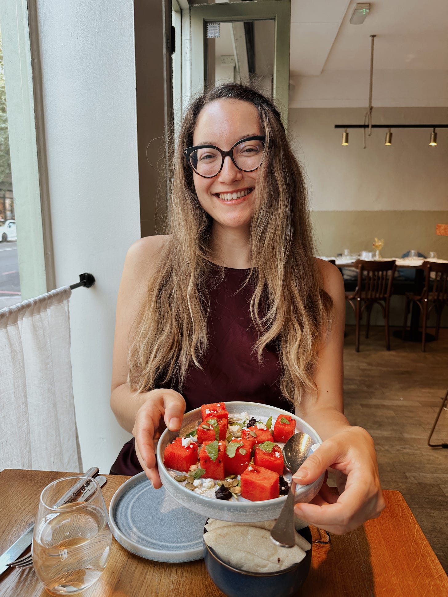 6pm - Dinner. My partner Kyle and I go out to an amazing dinner at a tapas place down the street from our London flat, and I remember how much I love watermelon and feta.