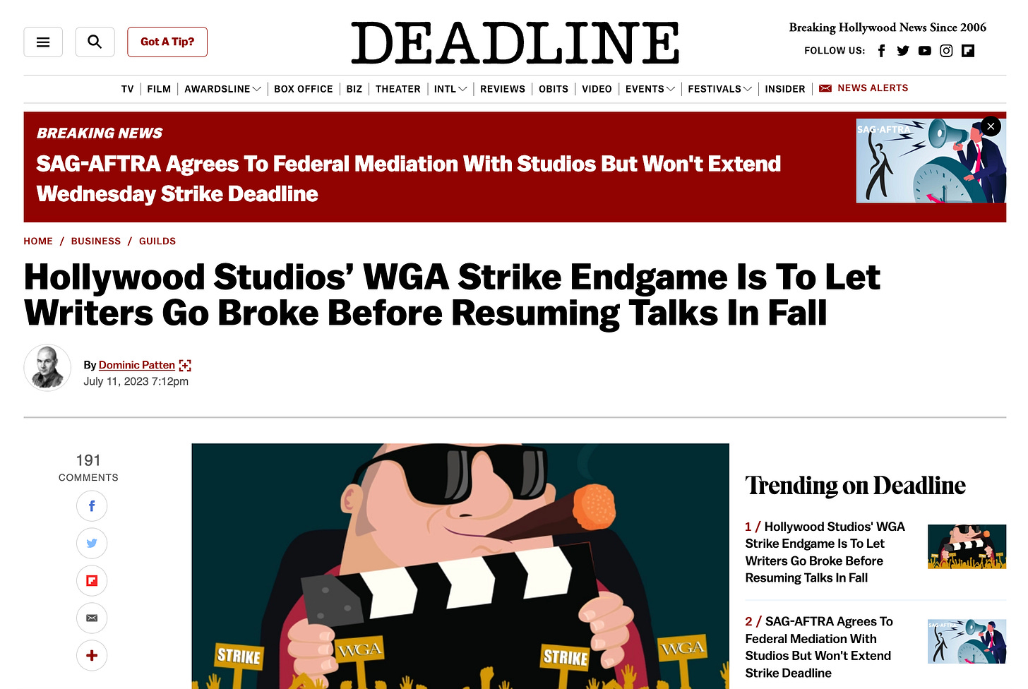 The article goes on to quote a studio executive who shares that “[t]he endgame is to allow things to drag on until union members start losing their apartments and losing their house.”