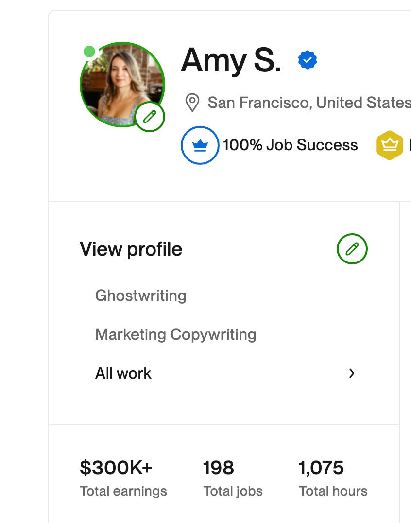 Upwork is a search engine. Use keywords in your headline and profile. If you’re a memoir ghostwriter? Say so. Use it repeatedly. Make it easy to be found.