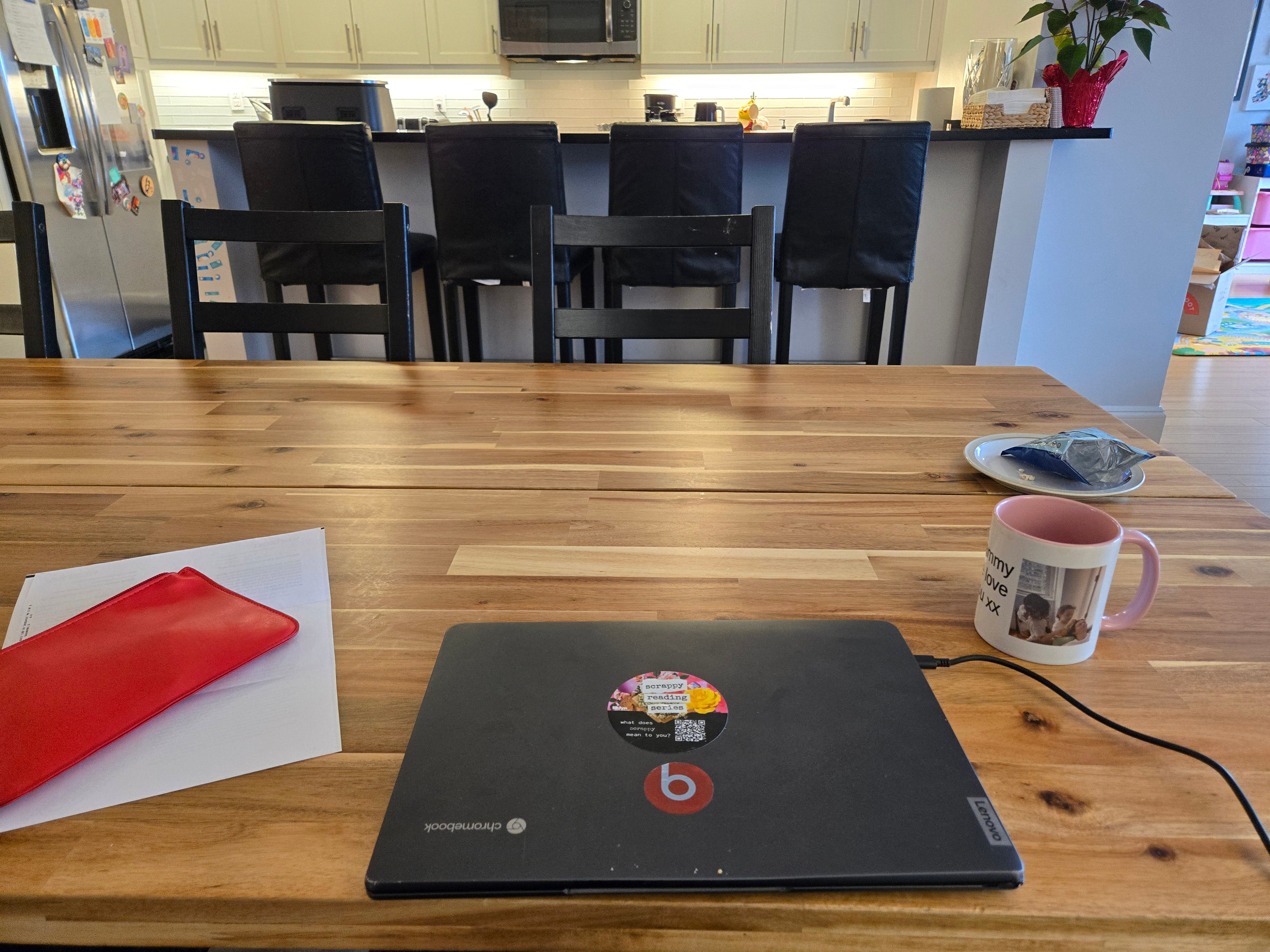 I usually write at the kitchen table, I’m at it right now. Here is a photo, complete with cup of tea and plate of snacks: