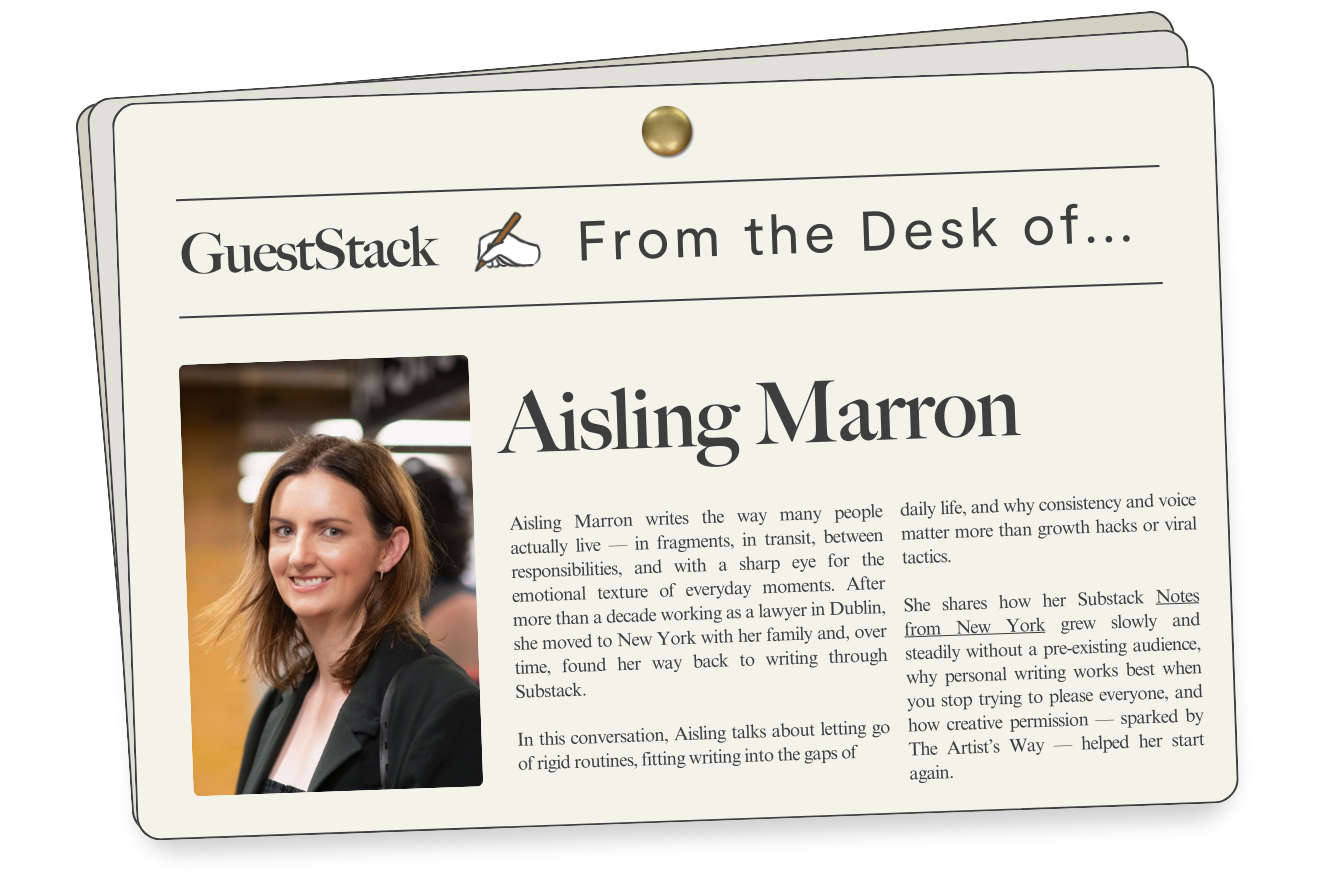 In this conversation, Aisling talks about letting go of rigid routines, fitting writing into the gaps of daily life, and why consistency and voice matter more than growth hacks or viral tactics. She shares how her Substack Notes from New York grew slowly and steadily without a pre-existing audience, why personal writing works best when you stop trying to please everyone, and how creative permission — sparked by The Artist’s Way — helped her start again.