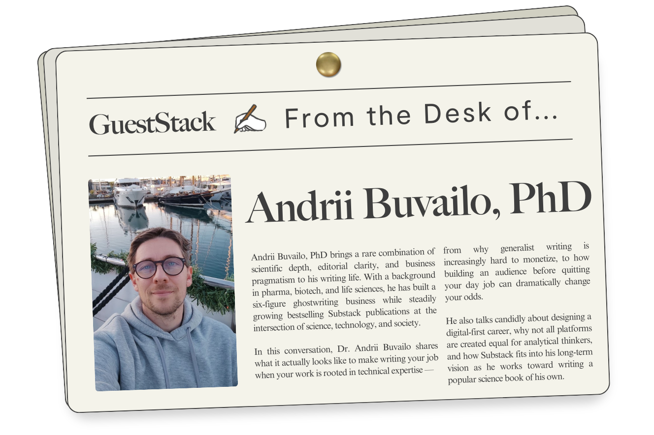 Andrii Buvailo, PhD brings a rare combination of scientific depth, editorial clarity, and business pragmatism to his writing life. With a background in pharma, biotech, and life sciences, he has built a six-figure ghostwriting business while steadily growing bestselling Substack publications at the intersection of science, technology, and society.